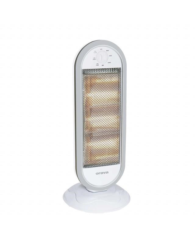 "Halogenový ohřívač se 3 topnými tělesy. Vysoká účinnost ohřevu bez víření vzduchu. 3 úrovně nastavení topného výkonu: 400 W, 800 W a 1 200 W Funkce oscilace. Praktická rukojeť pro přenos ohřívače. Bezpečnostní pojistka vypnutí při převrácení ohřívače. Napájení: 220 - 240V~ 50 - 60Hz, 1 200 W ".
