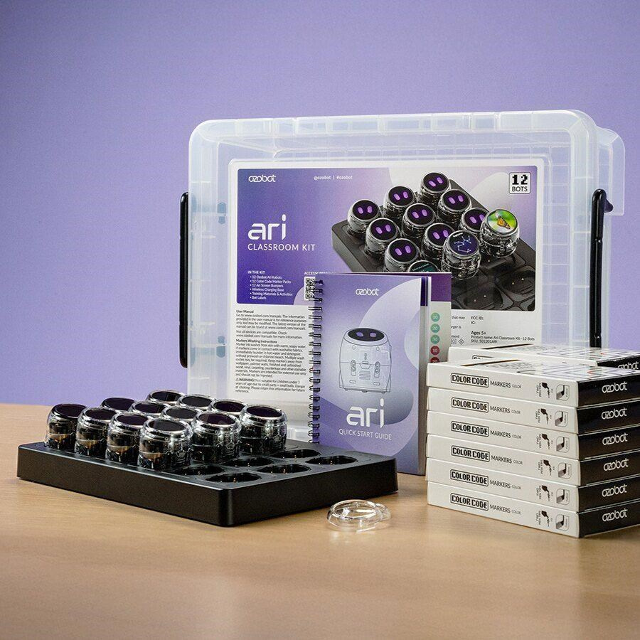 12 robotů Ozobot Ari Bezdrátová nabíjecí stanice Napájecí zdroj 12 balíčků barevných fixů s dvojitým hrotem Aktivity pro začátek Úložný box Dokumentace