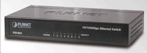 8portový přepínač. 8 portů 10/100 Base-TX. Automatická detekce 10/100Mbps, desktop. Miniaturní rozměr, kovová skříň, bez ventilátorů.