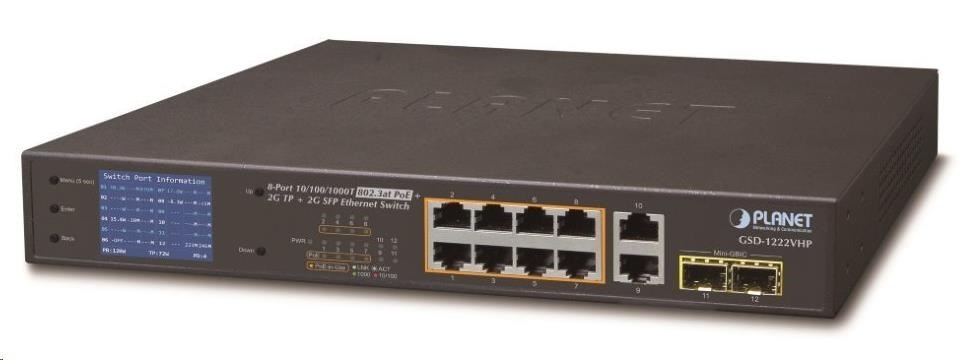 Neřízený switch disponující osmi RJ-45 porty, které jsou vybaveny PoE+ napájením standardu 802.3af/at a dosahují rychlostí 10/100/1000 Mbps. Dále jsou přítomny dva RJ-45 porty bez PoE napájení. Samozřejmostí je dvojice SFP portů pro rychlé datové přenosy až 1000 Mbps. Díky tomu je tento switch vhodný pro použití v kombinaci s IP kamerami.
