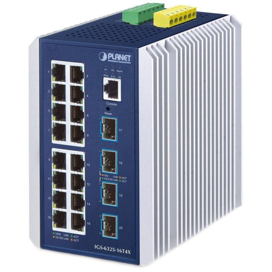 PLANET IGS-6325-16T4X Průmyslový přepínač a konvertor 16× RJ-45 10/100/1000Base-T, 4× SFP+ 10GbBase-SR/LR, 2× digitální vstup DI, 2× digitální výstup DO. Duální napájení v rozsahu DC 9–48 V / AC 24 V, krytí IP30, hliníková skříň, pracovní teplota -40 až +75 °C, přepěťová ochrana ESD do 6 kV, montáž na DIN lištu nebo přímo na zeď. Přepínače pro průmyslový Ethernet jsou určeny do náročných provozních podmínek s velkým rozsahem pracovních teplot, nejistým napájením a častými otřesy. Přepínače řady IGS se snadno instalují na standardní DIN lištu nebo přímo na zeď a umožňují nasazení dobře známé Ethernetové technologie i v průmyslovém prostředí. Stejně tak jsou vhodné pro instalace do venkovně umístěných skříní s velkým kolísáním pracovních teplot (typicky bezdrátové a MAN ISP aplikace). ZÁKLADNÍ SPECIFIKACE Fyzické vlastnosti: Porty: 16× RJ-45 10/100/1000 Base-T, 4× SFP+ 10Gb Base-SR/LR, 1× konzolový port RJ-45 (RS-232), 2× digitální vstup DI, 2× digitální výstup DO Paměť: 32k MAC adres Propustnost: sběrnice 112 Gbps, provozně 83,3 Mpps (64B) Podpora přenosu: JumboFrame 10 KB Provedení: DIN lišta, na zeď Napájení: 9–48 V DC duálně s 24 V AC, celkový příkon 14,4–24 W (zdroj není součástí balení) Ochrana: ESD do 6 kV DC, ochrana proti přepólování Provozní teplota: -40 až +75 °C Rozměry: 152 × 107 × 96 mm Hmotnost: 1503 g Funkce administrace: Správa: konzole přes RJ-45, Telnet, Web, SNMP v1/v2c/v3, SSHv2, TLS Řízení přístupu: Protokol ACL založený na IP a MAC L3 routing: max. 128 VLAN rozhraní, max. 128 pravidel, OSPFv2/v3, RIPv1/v2 ACL filtr a bonding: IP ACL, filtrace provozů dle IP adresy, protokolu, portu, TCP příznaků, až 256 pravidel MAC ACL, filtrace provozů dle MAC adresy, dle VLAN ID a kombinací příznaků priorit, až 256 pravidel Priorizace provozu QoS: 8 úrovní, priorizace provozu dle DSCP/ToS, čísla portu, 802.1p priority, nebo 802.1Q VLAN tagu Podpora VLAN: IEEE 802.1Q až 4K VLAN skupin Q-in-Q tunneling Private VLAN Edge (PVE) Protocol-based VLAN MAC-based VLAN IP Subnet-based VLAN Voice VLAN Multicast VLAN GVRP Spanning Tree Protocol: protokol STP, protokol IEEE 802.1d Spanning Tree protokol RSTP, protokol IEEE 802.1w Rapid Spanning Tree protokol MSTP, protokol IEEE 802.1s Multiple Spanning Tree Agregace linek: IEEE 802.3ad LACP, 16 portů v 10 skupinách Multicast: IGMP v1/v2/v3, podpora režimu IGMP querier mode, až 255 IGMP skupin, MLD v1/v2 Autentizace připojených zařízení: IEEE 802.1x, RADIUS/TACACS+ LLDP: ano (automatická detekce typu připojených zařízení) Diagnostika kabeláže: ano Průmyslové vlastnosti: zařízení je odolné proti pádu (IEC-60068-2-32) z výšky 75 cm na všechny dopadové části zařízení je odolné proti vibracím (IEC-60068-2-6) zařízení je odolné proti přetížení krátkodobému zrychlení 50g, dlouhodobému 4g, (IEC-60068-2-27).