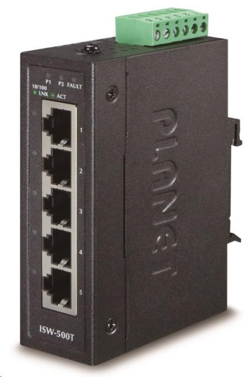 5portový 100Mbitový přepínač a konvertor pro průmyslové aplikace. Možnost redundantního napájení DC 12-48V / AC 24V, příkon <2W.