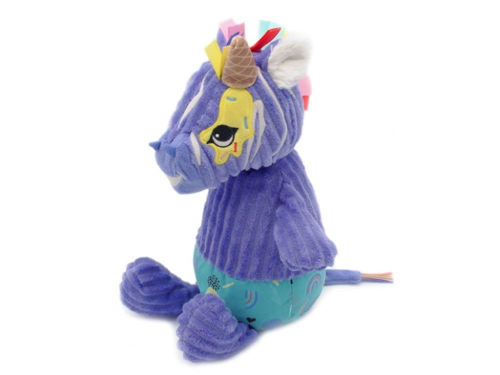 Roztomilý plyšák v podobě zebry, v krásné fialové barvě, je originálním dárkem k jakékoliv příležitosti. Úžasně heboučké plyšové zvířátko ušité z měkoučkého manšestru, ozdobené barevnými stuhami, je ideálním společníkem do postýlky nebo kolébky, do kočárku i na cesty. Plyšovou zebrou v dárkové krabičce a pokladničce můžete obdarovat miminko i větší slečnu..