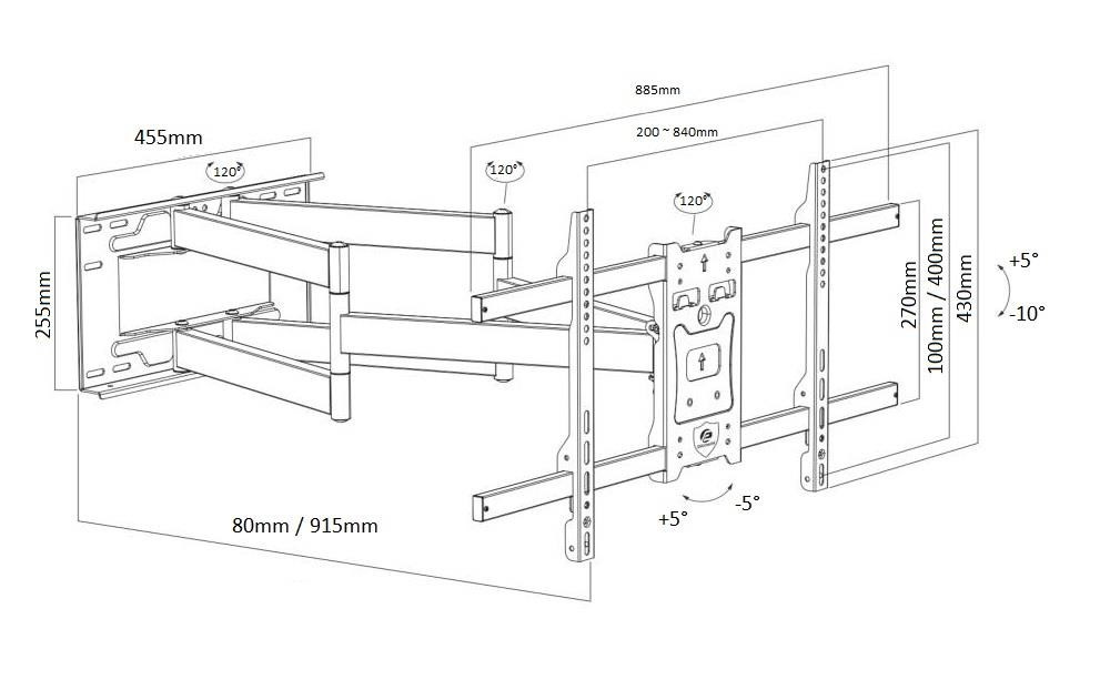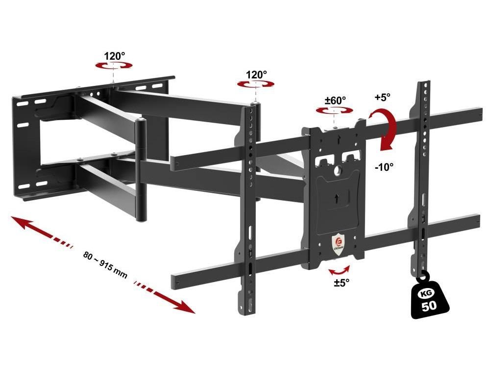 Kvalitní nástěnný držák na Tv 43-90", výsuvný 80-915mm, otočný +/-65°, náklon +5°/-10°, korekce roviny +/-5°, VESA 200x100 až 800x400, nosnost 50kg.Více