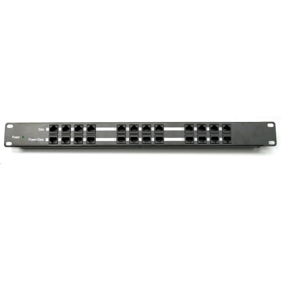 Panel integrující 12 pasivních POE injektorů vhodný pro napájení až dvanácti zařízení.