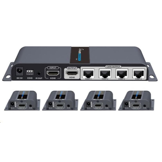 - Výstupy: 1x lokální výstup HDMI a vysílači, 4 x HDMI výstupy (Type A) na přijímačích