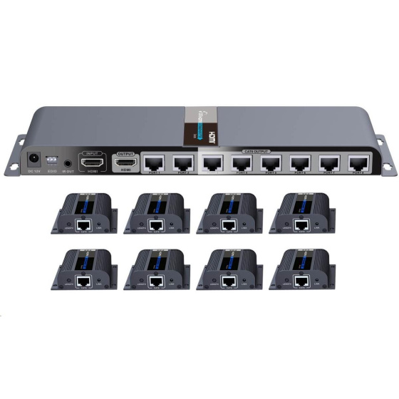 Extender se skládá z jedné vysílací jednotky s lokálním výstupem HDMI a osmi přijímači, které se propojí CAT6/6a/7 kabelem s vysílačem.