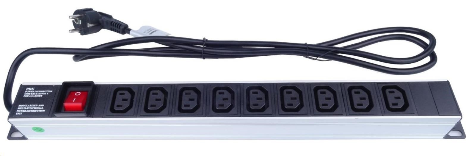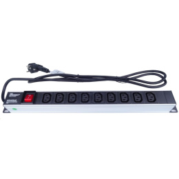 PremiumCord Panel napájecí do 19" racku 1U, 9xIEC (C13), 2m kabel,vypínač - provedení z eloxovaného hliníku - horizontální pro montáž do 19" Racku - výška 1U - 9x IEC (C13) 230V zásuvka - maximální proud: 16A - IEC (C13) zásuvky - 1.5mm2 průřez kabelu - délka kabelu 2m s konektorem do standardní české zásuvky - vypínač prosvětlený s plastovou krytkou proti náhodnému vypnutí - rozměry : šířka s pevnými úchyty: 485mm, výška: 40mm, hloubka: 44mm - pracovní teplota: 0-40°C - napájecí panel obsahuje sáček s kompletní sadou šroubů pro instalaci do 19' racku.
