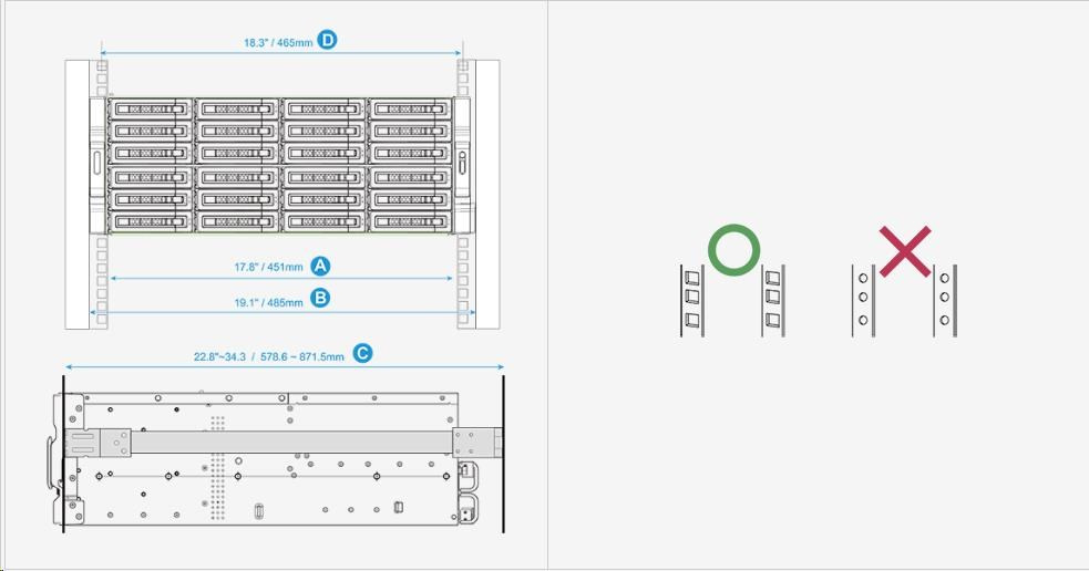 Sady kolejnic QNAP Rail Kits pomáhají při instalaci QNAP NAS do racku. Posuvné kolejnice umožňují zasunutí QNAP NAS dovnitř a vysunutí ven pro snadnou údržbu a správu. Modely QNAP NAS určené do racku vyhovují standardům rackové montáže ANSI/EIA-RS-310-D. Než nakoupíte serverový rack, nejprve se prosím ujistěte, zda tento serverové rack odpovídá příslušným specifikacím.