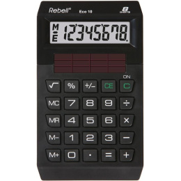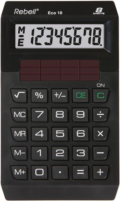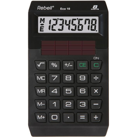 Základní 8místná kapesní ekologická kalkulačka se 100% solárním napájením, základními matematickými funkcemi, pamětí na 4 klávesy a certifikací Blue Angel. Vyrobeno ze 70 % z recyklovaných materiálů.