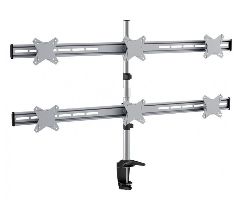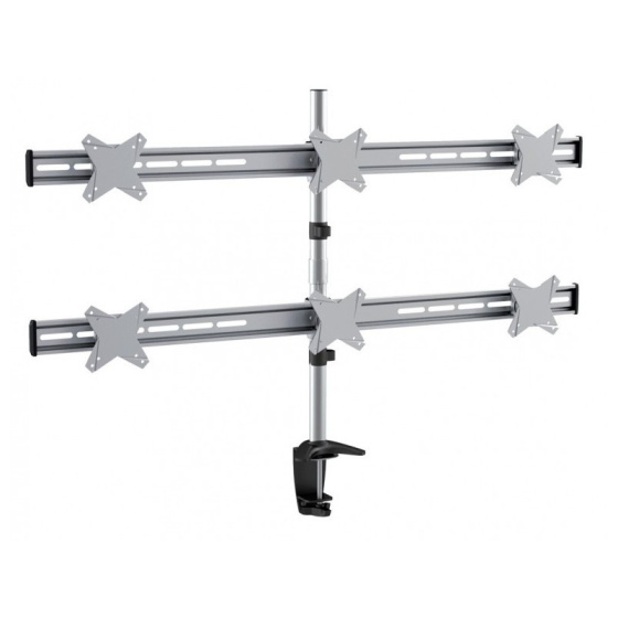 Stolní hliníkový držák s upevňovací klemou pro 4x LCD monitor a menší TV s uhlopříčkou 13"- 23" a hmotností maximálně 8kg na rameno. Uchycení VESA: 75x75, 100x100. Popis: vertikálně výklopný +15°/-15° a horizontálně otočný 360°..