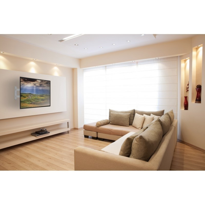Nástěnný ocelový držák s bočním natáčením na TV s uhlopříčkou 37"- 80" (109-203cm) a hmotností maximálně 50kg. VESA max 600x400, 3x pant, vertikálně výklopný +5°/-10° a horizontálně otočný +90°/-90°, vzdálenost od stěny 59-590mm, Cable Managment, barva bílá. Uchycení VESA: 200x200, 300x200, 400x200, 300x300, 400x300, 400x400, 600x400. Direction indikátor, jemné nastavení polohy oproti fixaci ve zdi +2°/-2°, rozměry 590 x 730 x 445 mm..