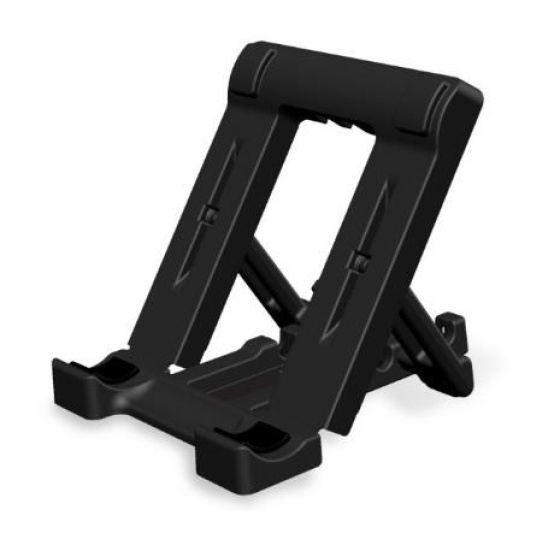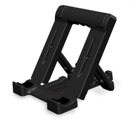 Stojánek pro chytré dotykové telefony v horizontální i vertikální poloze na stůl. Možnost nastavení 5 úhlů, skládací mechanizmus pro snadný transport, opření telefonu na spodní hraně, plastové provedení, černý..