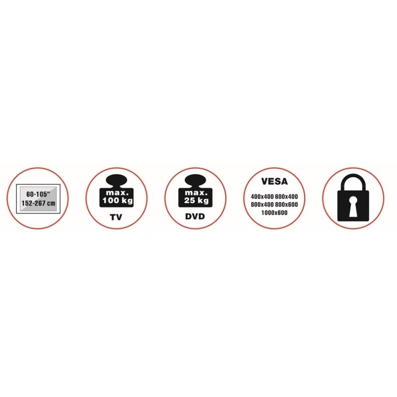 Televizní stolek na velké TV s uhlopříčkou 60"- 105" (152-267cm) a hmotností maximálně 100kg. Trubkový nosný profil 168,5cm na kolečkách s aretací, fixní držák s možností zamčení, police 28x33cm max 25kg, Cable managment, rozměry 109x68x168,5cm, materiál alu/ocel, barva černá. Uchycení VESA: 400x400, 600x400, 800x400, 800x600, 1000x600..