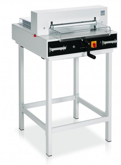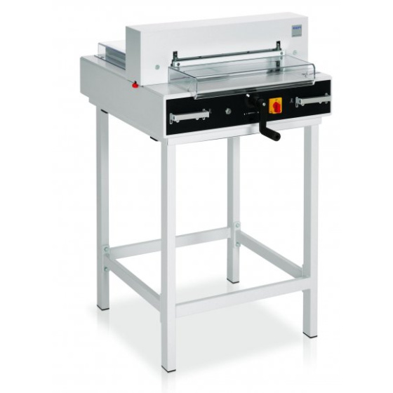 Pohodlné řezání do formátu A3, automatický lis, délka řezu 430 mm, hloubka vložení stohu 435 mm, výška stohu 40 mm. ZÁKLADNÍ VYBAVENÍ ŘEZAČKY: elektromechanický pohon nože a lisu optické vyznačení místa řezu nůž z kvalitní oceli automatický lis vřetenový posuv dorazu pomocí ruční kliky digitální zobrazení míry zadního dorazu (cm/palce) přesný zadní doraz precisní boční doraz nastavitelné vedení nože lze dodat jako stolní zařízení, volitelné příslušenství – podstava nebo skříňka BEZPEČNOSTNÍ VYBAVENÍ: spuštění řezu oběma rukama elektronicky jištěný, transparentní bezpečnostní kryt na předním stole transparentní bezpečnostní kryt na zadním stole automatický zpětný chod nože a lisu z každé pozice brzda pro okamžité zastavení nože hlavní vypínač a bezpečnostní zámek s klíčkem pomůcka pro výměnu nože s ochranným krytem ostří nastavení hloubky zářezu nože (z venku) snadná a bezpečná výměna nože z přední strany bez nutnosti sundání krytů řezačky jednoduché otočení / výměna řezací lišty (z venku) dřevěný doraz.