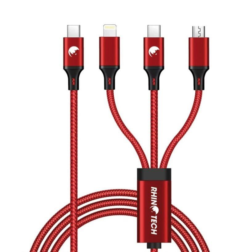 Kvalitní RhinoTech opletený multifunkční datový a nabíjecí kabel 3v1 s univerzálním konektorem USB-C, zakončený hned trojicí konektorů (Lightning nabíjecí, USB-C nabíjecí/datový port port a MicroUSB – nabíjecí port).