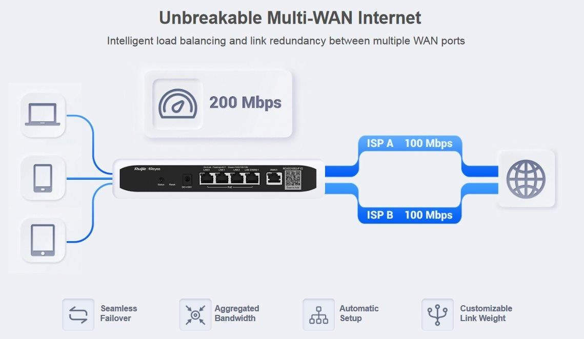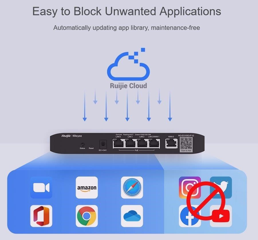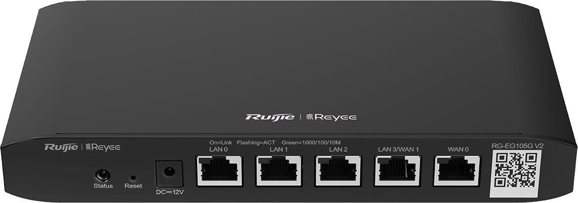 Registrace dealerské ceny: https://docs.google.com/forms/d/1sWwsswsbBk36eZx4CJrfl47qUvrORQyYz7kMjrt2f_c/prefill Popis produktu Ruijie RG-EG105G V2 je kabelový Gigabitový router s VPN vhodný do domácností i malých firem. Bezpečný a spolehlivý router s vlastním webovým managementem, možností správy přes Ruijie Cloud odkudkoliv a kdykoliv ale také blokováním obsahu na základě typu služeb z automaticky updatovaného seznamu nebo URL, inteligentní Multi-WAN load balancing a captive portál. Router disponuje 2 Gigabitovými WAN porty z čehož jeden je LAN/WAN, 3 Gigabitovými LAN porty a celkovým výkonem v NATu 600 Mbps. Router pro přístup do lokální sítě umožňuje nastavení i několika možností VPN serverů a to konkrétně: IPsec, PPTP, L2TP a OpenVPN. Obsah balení • Zařízení • Napájecí adaptér 12V Technické parametry Konektory a rozhraní Možnost více WAN:Ano Rychlost LAN:(3) 10/100/1000Mbps + (1) 10/100/1000Mbps LAN/WAN Gigabit LAN:Ano Napájení Typ napájení:DC konektor Max. spotřeba energie [W]:6 Napájení přes konektor/svorkovnici:12V DC Fyzické charakteristiky Provedení:Desktop Ventilátory:Bez ventilátoru Šasi:Kovové Tlačítka:Reset Provozní teplota [°C]:0 až 40 Šířka [mm]:207 Výška [mm]:28 Hloubka [mm]:109 Hardware CPU:Dual Core Frekvence CPU [MHz]:880 Počet CPU jader:2 RAM [MB]:128 Obecné Propustnost NAT [Mb/s]:600 Software Podporované VPN:PPTP, L2TP, IPSec, OpenVPN.
