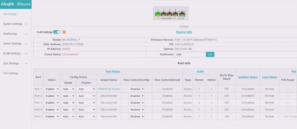 Popis Reyee RG-ES206GC-P Smart mananged PoE switch, 4x PoE