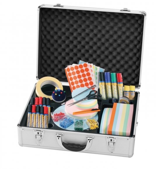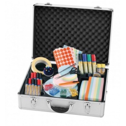 Sada pro moderátory Magnetoplan Alu kufr. Robustní hliníkový kufr se širokou škálou pomůcek pro moderátory, učitele nebo lektory. Obsahuje: 504 Komunikačních štítků 200×100mm, pravoúhlé provedení, 6 barev 200 Komunikačních štítků kulatých o průměru 100 mm, 5 barev 150 Komunikačních štítků kulatých o průměru 140 mm, 5 barev 150 Komunikačních štítků kulatých o průměru 190 mm, 5 barev 150 Komunikačních štítků oválných 190×110 mm, 5 barev 10 Popisovačů na bílé magnetické tabule nebo flipcharty (6× černý, 4× červený) 4 Popisovače Jumbo, se širokou stopou (černý, modrý, červený, zelený) 400 Připínáčků na korkové tabule (á 100 ks červený, modrý, zelený, žlutý) 1 Mechanické teleskopické ukazovátko 2 Lepidla papíru 20 g 1 Nůžky na papír (velikost 15 cm) 1 Odlamovací nůž šíře 9 mm 1 Lepící páska 25 m x 19 mm 1 Lepící maskovací páska 50 m x 30 mm 1200 Samolepky – barevné body, á 300 červená, zelená, žlutá, modrá Kufr je vybaven zámkem a řemenem pro zavěšení na rameno. Rozměry kurfru: 470×165×340 mm Hmotnost: 11 kg.