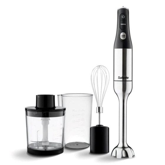 Salente Mixxo přichází do vaší kuchyně i s bohatým příslušenstvím: využívat můžete šlehací nástavec s nerezovou metličkou, mixovací nádobku o objemu 600 ml (s odměrnými ryskami po 100 ml) a taky sekáček s objemem 500 ml, který je vybaven nerezovými noži a silikonovou protiskluzovou podložkou. Pořízením tohoto všestranného mixéru zkrátka získáte kompletní vybavení, které posune vaše gastronomické kouzlení o úroveň výš.