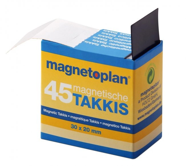Samolepící magnety Magnetoplan Takkis, 45 ks velikosti 30×20 mm a tloušťky 0,75 mm. Lze je snadno vytahovat z dávkovače. Nalepením samolepících magnetů na zadní stranu papíru, kartonu, fotky atp, vytvoříte magneticky přichytitelný objekt. Můžete jej pak připevnit na magnetickou tabuli, do magnetické vitriny nebo na flipchart. Výhodou je, že magnety Takkis umožňují vytvořit z vnějšku neviditelné magnetické přichycení..