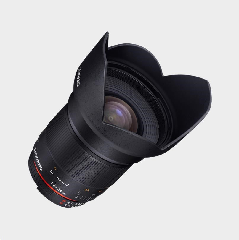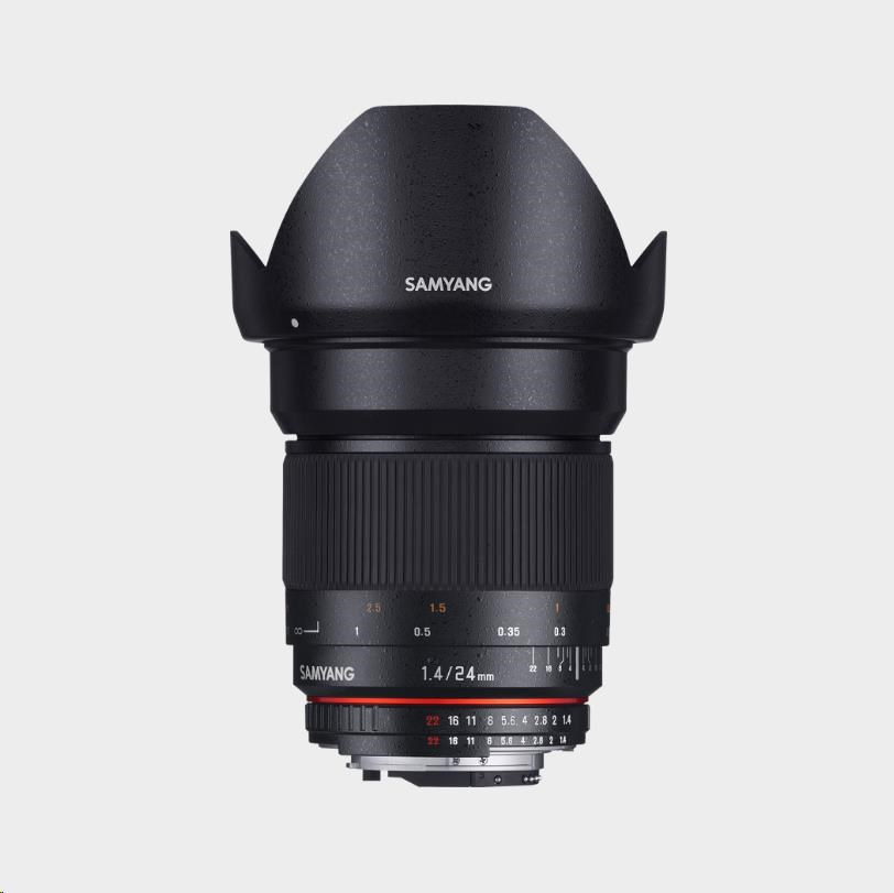 Samyang 24mm f/1.4 ED AS IF UMC is a fast, manually focused wide-angle lens compatible with full frame sensors. It is available in many mounts, including mirrorless cameras with APS-C or Micro Four Thirds sensors.
