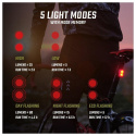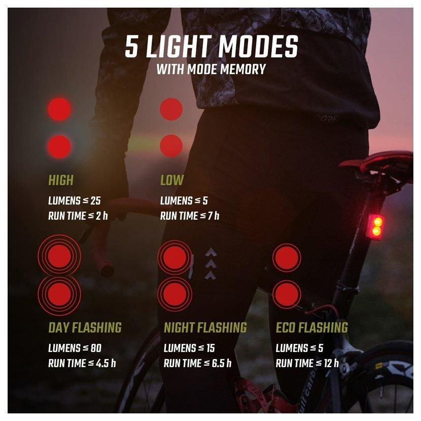 S Buster RL 80 máte na výběr z pěti světelných režimů, pomocí kterých můžete individuálně nastavit intenzitu osvětlení a dobu výdrže baterie. V režimu High dosahuje světlo Buster RL 80 světelného výkonu 25 lumenů po dobu až 2 hodin, v režimu Low svítí až 7 hodin při světelném výkonu 5 lumenů. Režim Day Flash dokáže pomocí dvou červených blikajících LED upozorňovat na cyklistu po dobu 4,5 hodin se světelným výkonem 80 lumenů. V režimu Night Flashing bliká zadní světlo až 6,5 hodiny při světleném výkonu 15 lumenů. Pokud jízda trvá déle, dokáže zajišťovat viditelnost v silničním provozu režim Eco Flash až po dobu 12 hodin.