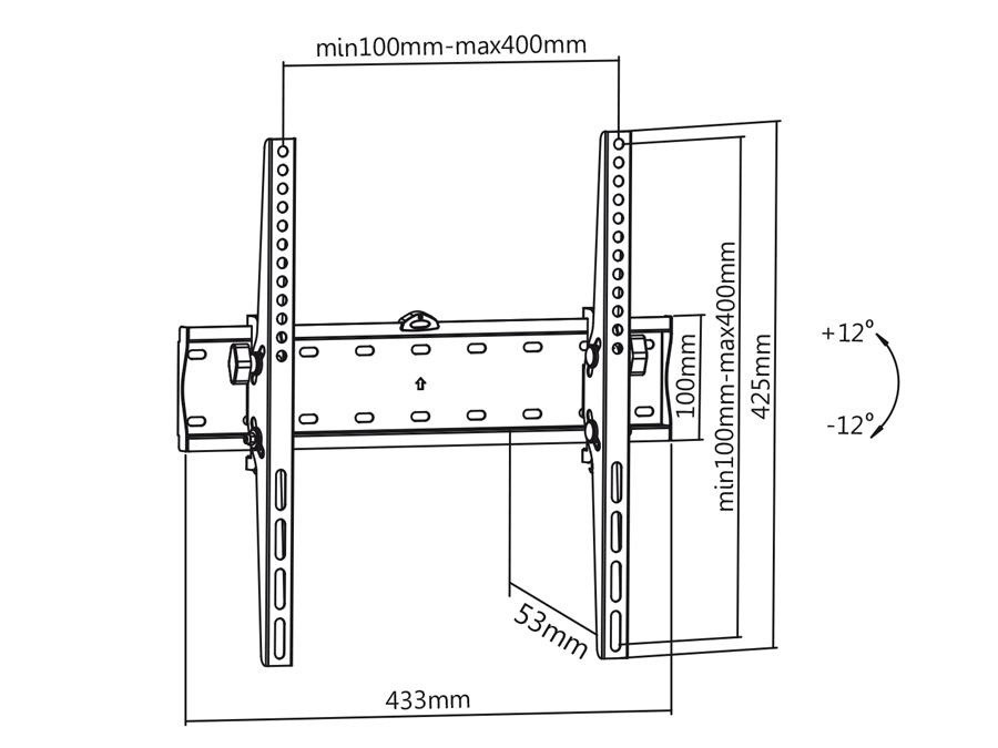 Kvalitní nástěnný držák pro zavěšení Tv 32-60" a naklopení +/-12°, VESA standardy 75x75 až 400x400, vzdálenost od zdi 53mm, nosnost 40kg.Více