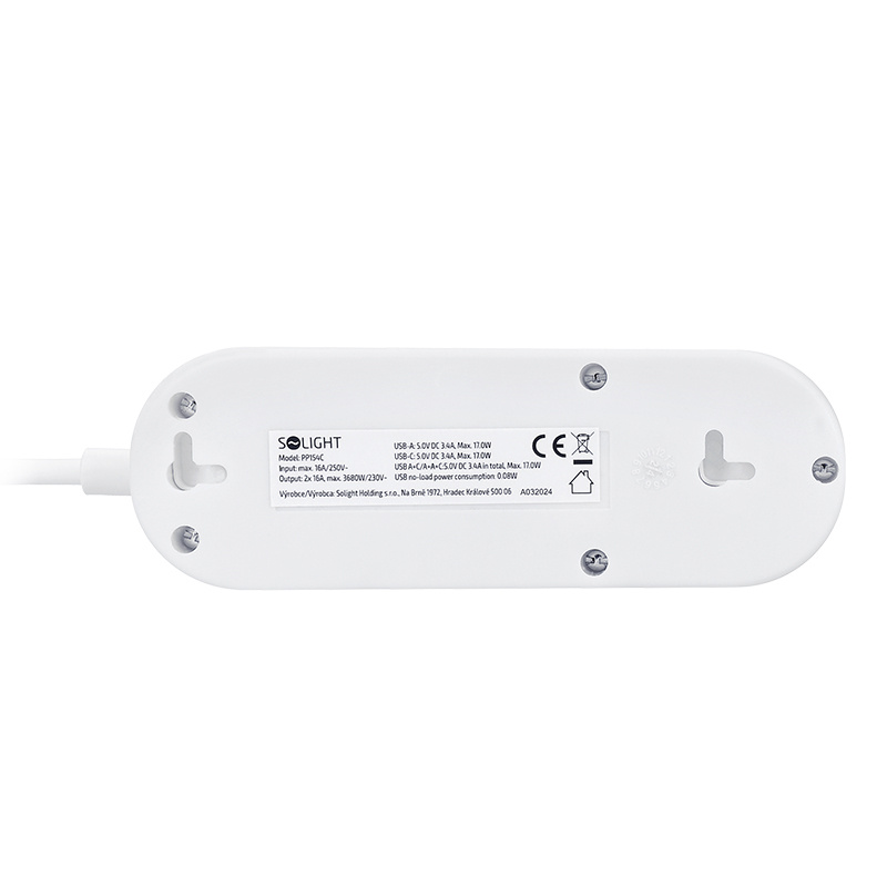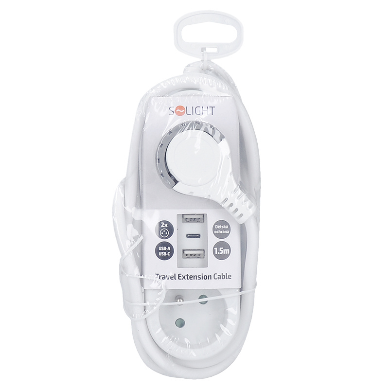 Popis Solight 2z + USB A+C 17W, cestovní prodlužovací přívod 1.5m, bílý