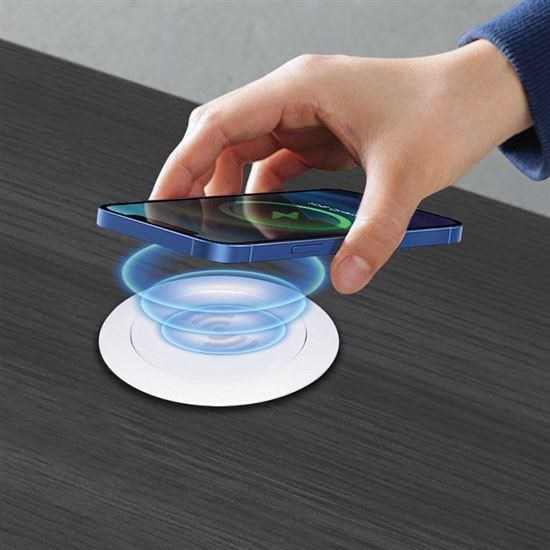 Vestavná bezdrátová nabíjecí podložka, Wireless Qi 15W, AC/DC adaptér DC 12.0V / 2.0A, 24W, přívodní kabel 1.5m, průměr otvoru v desce stolu: 60mm, nabíjecí výkony 15W – 10W – 7.5W – 5W, barva vrchního krytu: bílá.Více