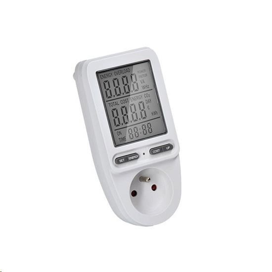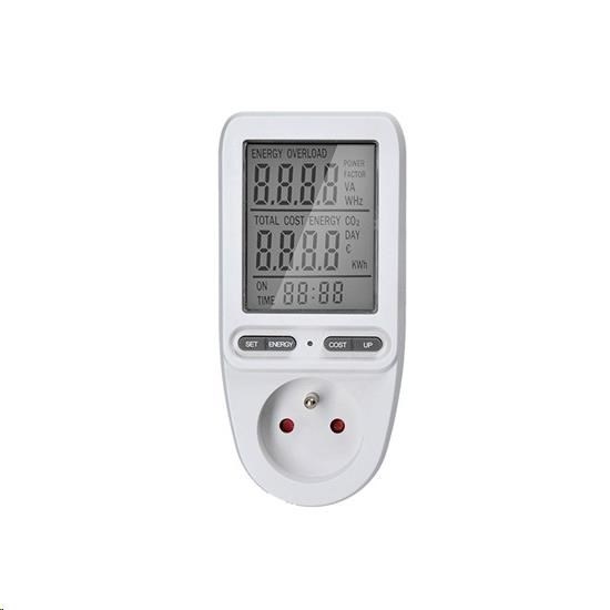 velký a přehledný LCD displej, úhlopříčka 3" - 7,5cm max. měřená doba: 9999 dní max. měřená spotřeba: 9999kWh min. množství zaznamenávaného příkonu: 2W, max.: 3680W/16A celková doba odběru nastavení ceny za energii 4 tlačítka pro jednoduchou obsluhu přesný výpočet ceny a měření spotřebované energie dětská pojistka indikace překročení max. příkonu měření elektrických veličin: proud, napětí, frekvence, okamžitý odebíraný výkon integrovaný stabilizátor napětí až do +- 1,5% odchylky od jmenovitého napětí pro přesné měření pracovní teplota: 0 až + 50°C napájení: AC 230V, 50Hz zabudovaná záložní baterie pro uchování naměřených hodnot.