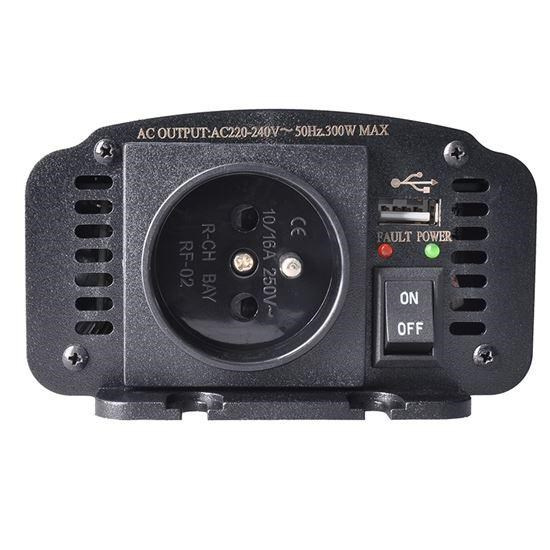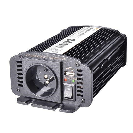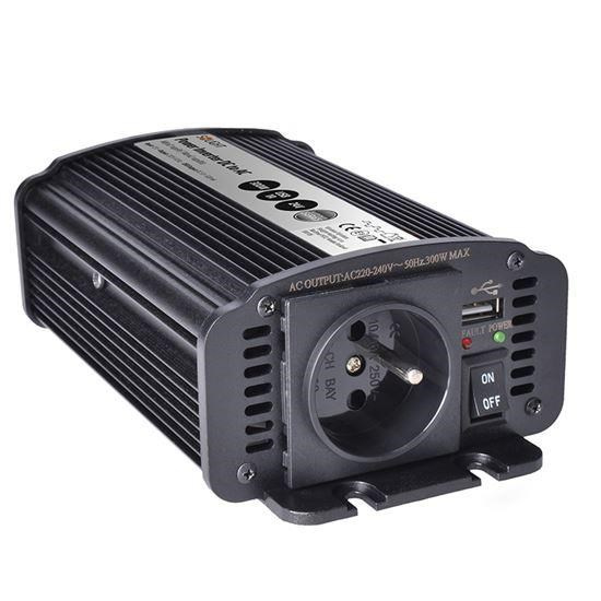 Max. zatížení výstupu (stálé): 300W, max. zatížení výstupu (ve špičce): 600W, nominální vstupní napětí (DC): 12V, nominální výstupní napětí (AC): 230V, 50Hz, výstupní zvlnění má tvar modifikané sinusoidy, napájení: DC 12V cigaretový autoadaptér (součástí balení), ochrana proti přehřátí, zkratům, přepětí, přetížení a vybití baterie, pracovní teplota: -20°C až +50°C.Více