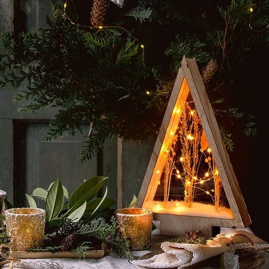 Přírodní, vánoční dřevěná dekorace ve tvaru vánočního stromku se zasněženými zimními květinami, podsvícené tenkým LED řetízkem, počet LED diod: 30, barva světla: teplá bílá (žlutá), napájení: 2 x AA baterie (nejsou součástí), výdrž baterií: cca 100hodin (v závislosti na kvalitě baterií), stupeň krytí: IP20 (vnitřní použití).Více