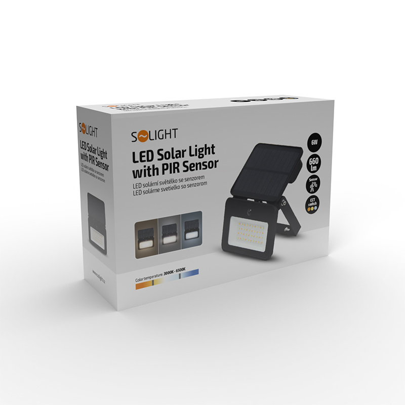 Popis Solight LED solární reflektor se senzorem, 6W, 660lm, 3CCT, Li-Ion, černá
