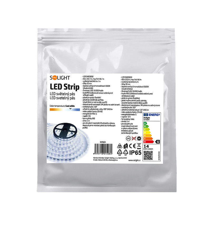 Popis Solight LED světelný pás, 5m, SMD5050 60LED/m, 14,4W/m, IP65, studená bílá