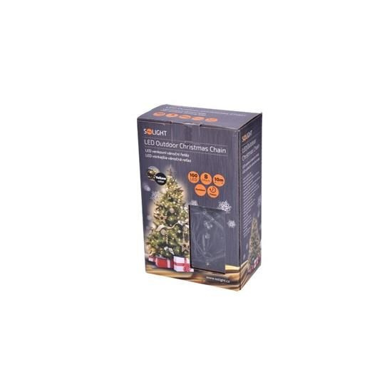 Popis Solight LED venkovní vánoční řetěz, 100 LED, 10m, přívod 3m, 8 funkcí, časovač, IP44, teplá bílá