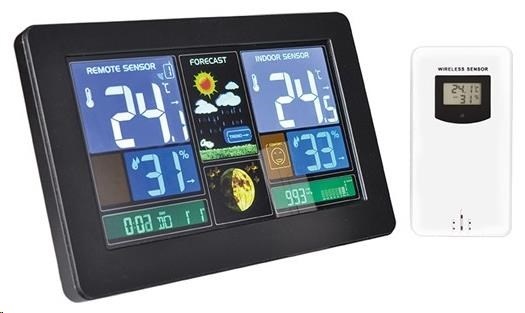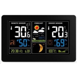 měření vnitřní teploty: 0°C až +50°C měření venkovní teploty: -20°C až +60°C měření vnitřní a vnější vlhkosti: 20% - 95% měření atmosférického tlaku: 600 hPa/mb - 1100 hPa/mb USB nabíjecí adaptér DC 5V/1000mA upozornění na dosažení nastavené venkovní teploty paměť minimálních a maximálních dosažených hodnot teploty a vlhkosti, vnější i vnitřní možnost připojení až 3 bezdrátových senzorů, funkce cyklického přepínání mezi jednotlivými senzory 1 bezdrátový senzor (součástí balení), dosah 60 m ve volném prostoru předpověď počasí v 6 grafických úrovních s indikátorem vývoje ukazatelé stavu baterie pro meteostanici i bezdrátový senzor ukazatel úrovně komfortu čas řízený rádiovým signálem, kalendář, fáze Měsíce budík s intervalem, odložení buzení 5 min indikátor vývoje teplot, tlaku a vhkostí barevný podsvícený displej 7.5" (17,0 x 9,4cm) úsporný režim displeje, 5 úrovní podsvícení displeje, rozsvícení displeje a odložení budíku pomocí dotykového senzoru na horní hraně meteostanice. rychlý a komfortní přístup k ovládacím tlačítkům na boční hraně meteostanice otvor pro uchycení na zeď, opěrný stojánek rozměry meteostanice: 20,5 x 13 x 3 cm max. přídavný senzor pro tuto meteostanici má označení "TE8S" napájení: barva: černá hlavní jednotka: 2 x AA (LR03) baterie (není součástí balení) adaptér AC 230V,50Hz /DC 5V, 1200mA (součástí balení) senzor: 2 x AA (LR03) baterie (není součástí balení)