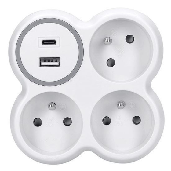 Výstup 3x 15A, max. 3500W, 1x USB A + 1x USB C nabíječka, max. 2400mA, pootočená horní zásuvka, dětské pojistky, barva: bílá-šedá.Více