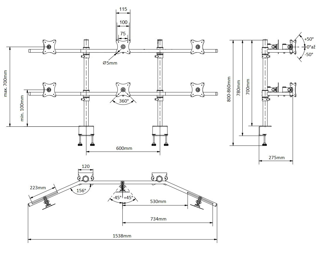Stolní držák na 6 monitorů 17-27" parabola, doladění pozic monitorů dle potřeby, otáčení, naklápění, pivot, posun do stran, VESA 75x75 a 100x100, nosnost 60kg.Více