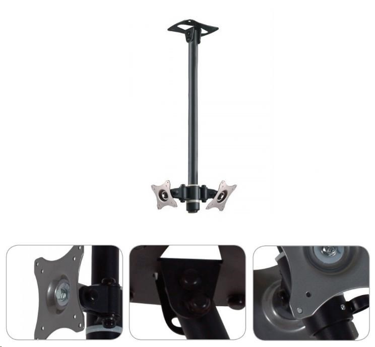 Stropní držák pro zavěšení 2 televizorů nebo monitorů, nastavení výšky, otočení, náklon, funkce pivot.Více