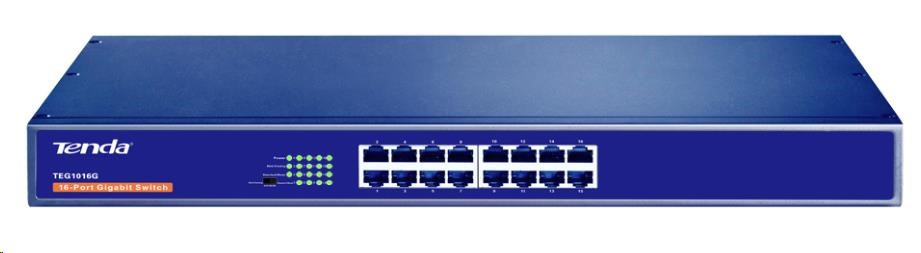 Tenda TEG1016G přepíná data v síti pomocí 16ti portů RJ45 s přenosovou rychlostí 10/100/1000 Mb/s a automatickou detekcí rychlosti. Maximální propustnost je 32 Gb/s. Auto MDI/MDIX na každém z portů. Přepojování uzlů v režimu Store-and-Forward. Full-duplex kontrola toku 802.3x.