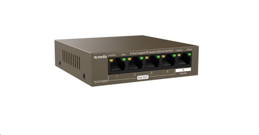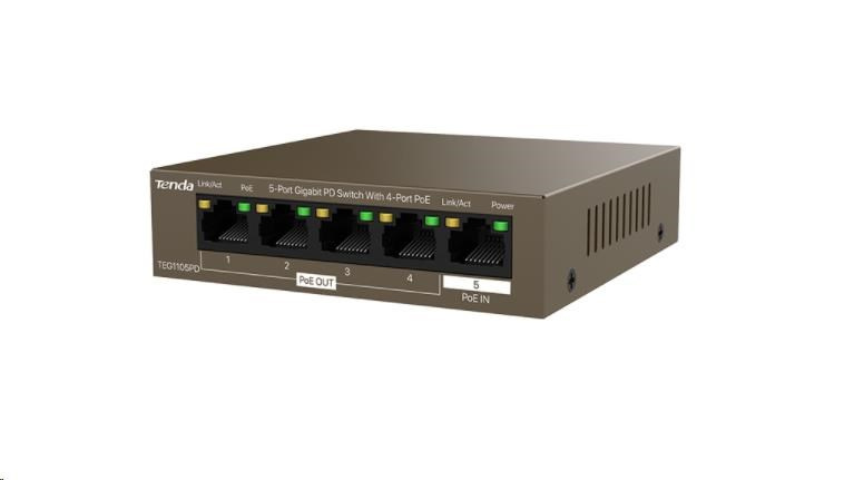 Tenda TEG1105PD přepíná data pomocí 5ti portů RJ45 s přenosovou rychlostí 10/100/1000 Mb/s s automatickou detekcí rychlosti. Port 5 je určen pro připojení do sítě a také pro napájení switche. Je nutné do tohoto portu "posílat" také PoE napájení IEEE 802.3at 30W z předchozího zařízení v síti. Zbývající 4 PoE porty podporují PoE 802.3af pro napájení dalších koncových zařízení. Switch podporuje stabilní 8 jádrové PoE napájení, ochrana proti přepětí 6kV. Podpora přepojování uzlů v módu Store-and-Forward. Full-duplex kontrola toku 802.3x, half-duplex kontrola toku v režimu Back-Pressure. Switch je také vhodný do kanceláří, jelikož neobsahuje žádné ventilátory, je fanless. Tenda TEG1105PD je vhodná jak do velkých náročných projektů, ale také do menších a středních firem a domácností.