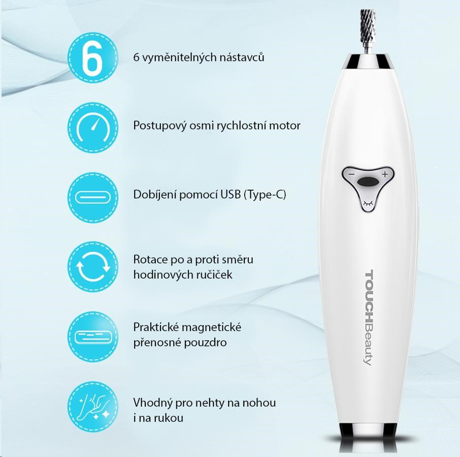 Sada na manikúru a pedikúru TOUCHBeauty 1733 je vhodná pro tvarování, opravy, broušení, leštění a vyhlazování nehtů. Nabízí dokonce 6 různých nástavců, vysoký výkon až 12 000 ot./min., který se nastavuje v 8 rychlostních stupních, a cestovní magnetické pouzdro na nástavce. Kombinace integrované baterie a USB nabíjení přispívá k Vašemu pohodlí a zároveň představuje ekologičtější variantu k přístrojům, které používají tužkové baterie. Díky obousměrné 360° rotaci je bruska vhodná pro praváky i leváky.