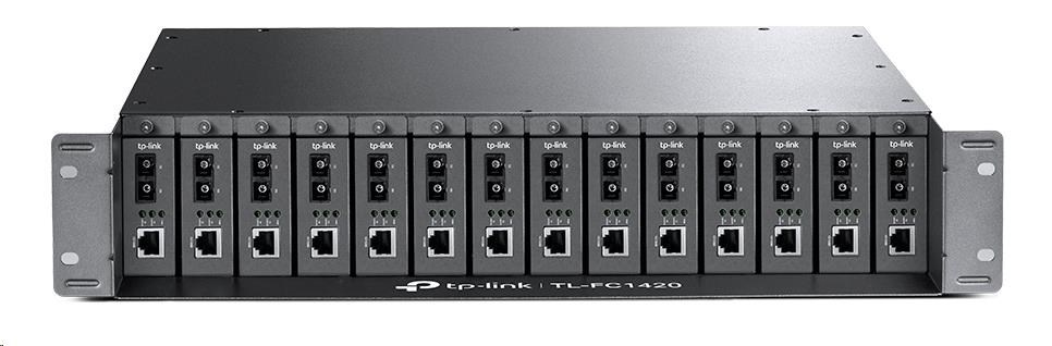 14slotové rackové šasi TL-FC1420 je speciálně určeno pro usazení 14 média konvertorů od společnosti TP-Link pro zajištění centrálního napájení, čímž šetří místo a napájecí kabely. Nepřetržitý provoz je pro komunikaci přes optické vedení velmi důležitý, proto je šasi vybaveno volitelným redundantním napájecím zdrojem a funkcí výměny za provozu, které umožňují instalaci / odebrání konvertoru bez vypnutí napájení šasi. Pro stabilizaci provozního výkonu a prodloužení životnosti jsou navíc uvnitř instalovány dva chladicí větráky. Společně s řadou FC média konvertorů Gigabit / Fast Ethernet představuje zařízení TL-FC1420 ideální řešení pro vaši síť vyžadující převod médií.