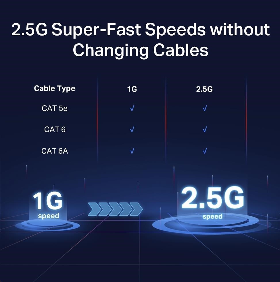 • Bezproblémové použití kabelů - Okamžitě zvyšte rychlost sítě na 2,5 Gbit/s bez nutnosti výměny kabelů za kabely standardu Cat6, čímž si ušetříte peníze i námahu.