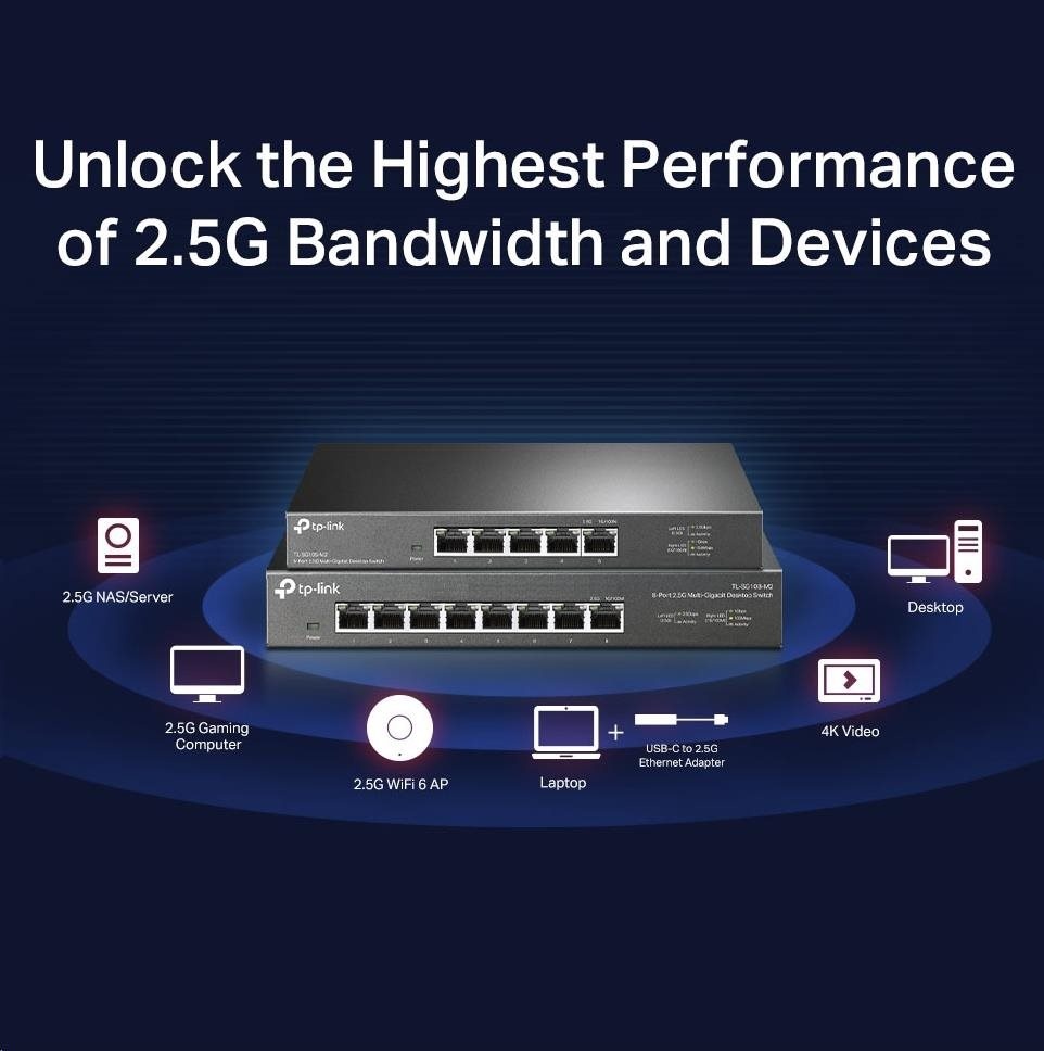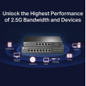 • Osm portů 2,5 Gbit/s. - Osm 2,5gigabitových portů umožňuje využít nejvyšší výkon multigigabitové šířky pásma a vašich zařízení, a poskytuje kapacitu přepínání až 40 Gbit/s.