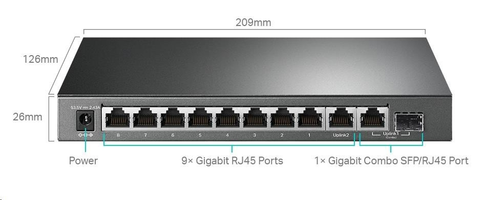 | Interface | 9× 10/100/1000 Mbps RJ45 Ports 1× 1000 Mbps Combo SFP/RJ45 Port AUTO Negotiation/AUTO MDI/MDIX |