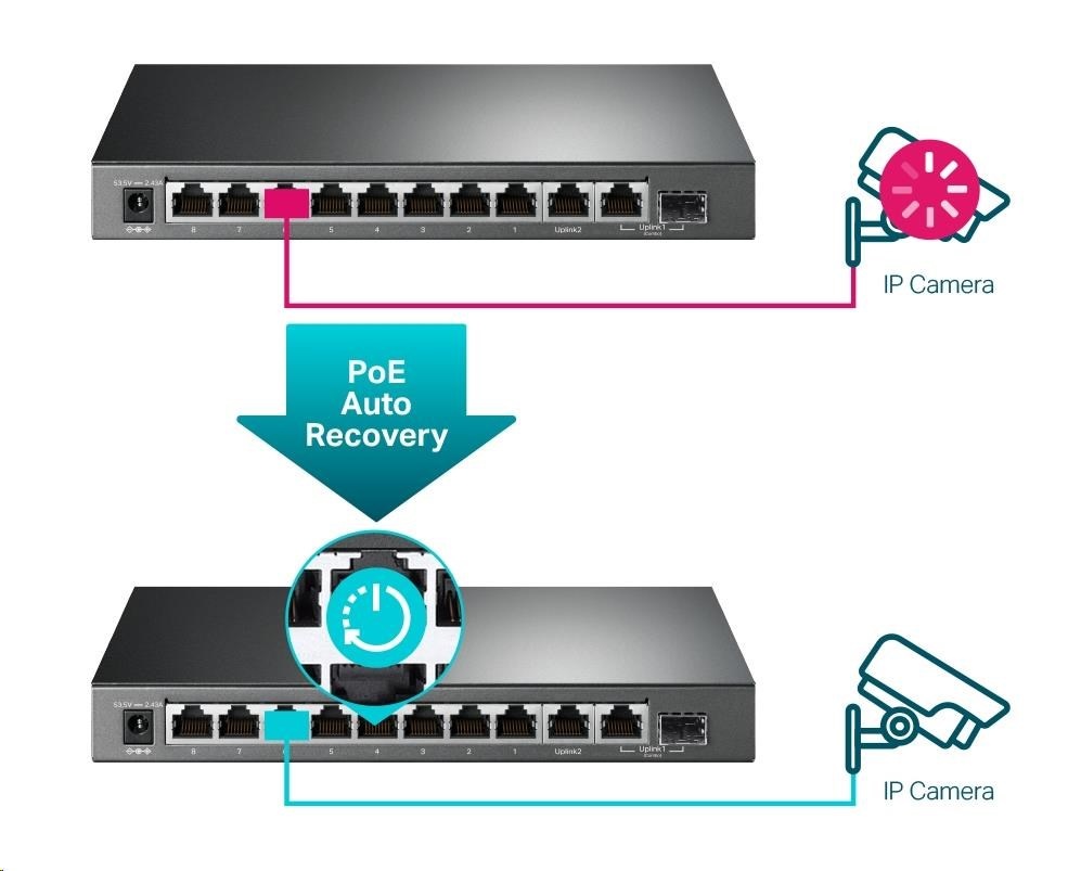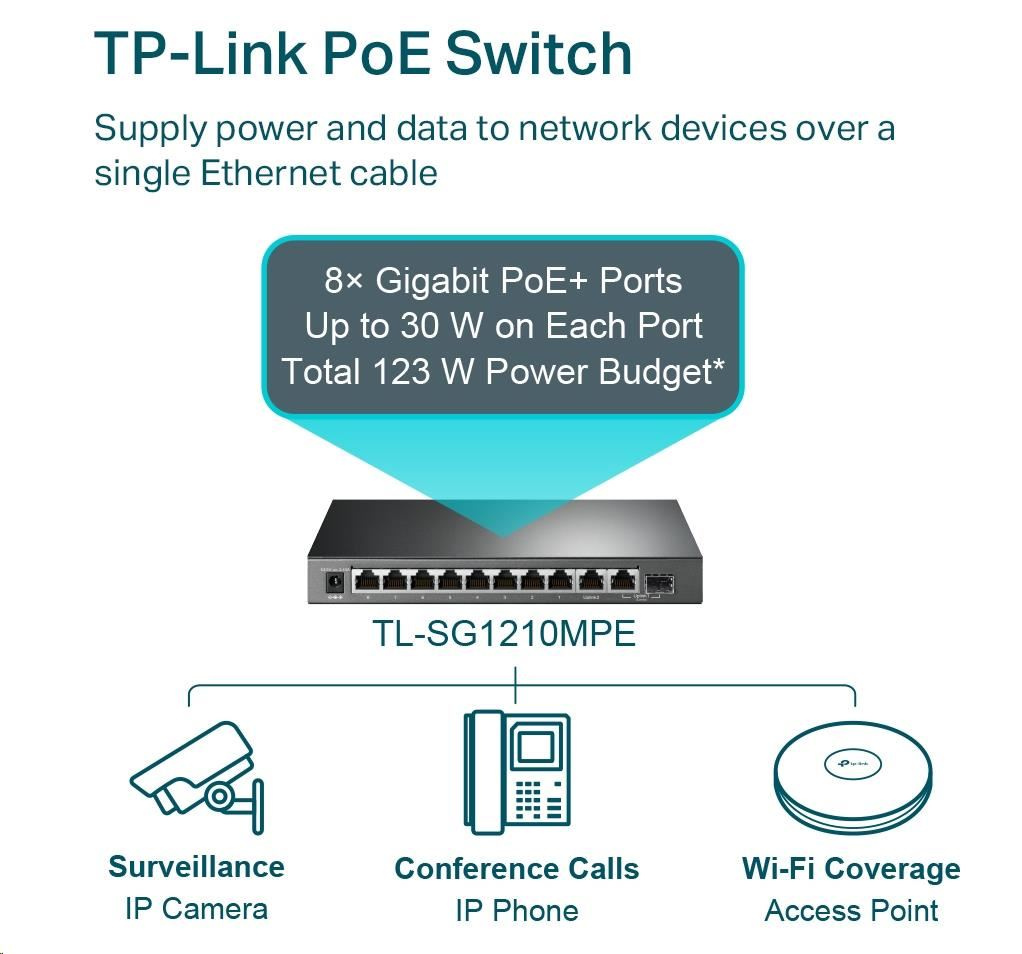 TL-SG1210MPE je plně kompatibilní se zařízeními PoE, jako jsou IP kamery, přístupové body a IP telefony. Lze také použít pro kabelové připojení zařízení bez PoE, jako jsou počítače, tiskárny a IPTV.