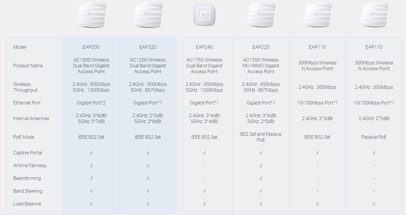 | Package Contents | 300Mbps Wireless N Ceiling Mount Access Point EAP110 Passive PoE Adapter, Power Cord, Mounting Kits, Installation Guide |
