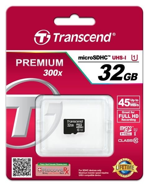 Popis TRANSCEND MicroSDHC karta 32GB Premium, Class 10 UHS-I 300x, bez adaptéru